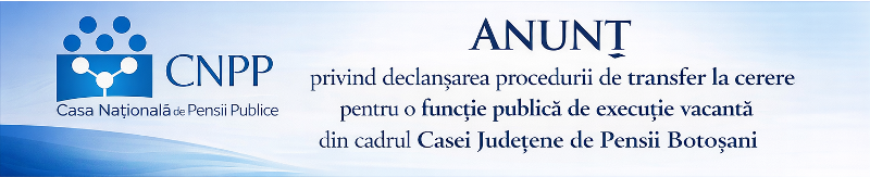 Casa Județeană de Pensii Botoșani anunță ocuparea prin transfer la cerere, conform prevederilor art. 502, alin. (1), lit. c și art. 506 alin. (1), lit.b), alin. (2), alin. (5) alin (8) și alin. (9) din O.U.G. nr. 57/2019 privind Codul administrativ, cu modificările și completările ulterioare, a unei funcţii publice de execuţie vacante: